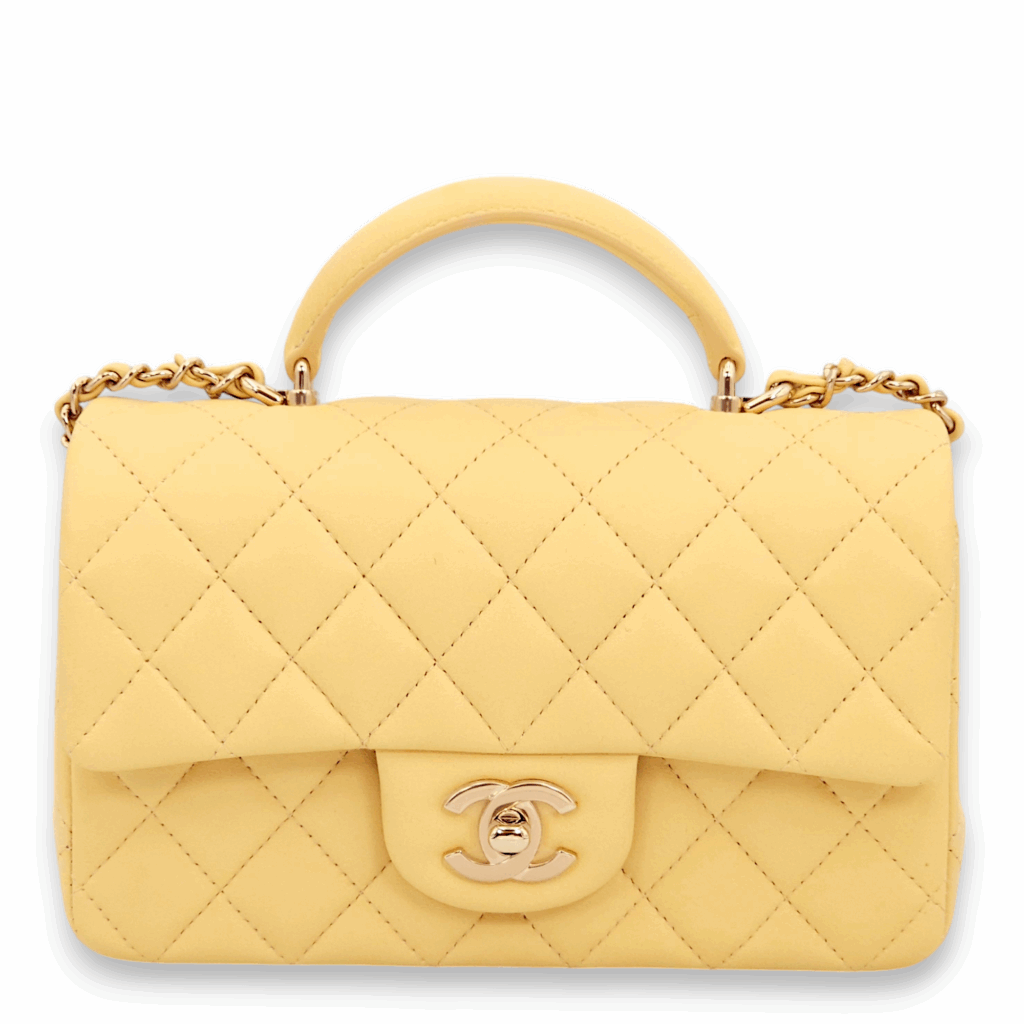 Quilted Rectangle Mini Yellow Top Handle Bag in Lambskin, Gold hardware