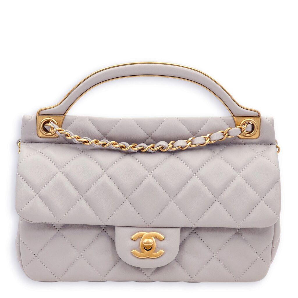 Quilted Grey Top Handle Bag in Lambskin, Gold hardware