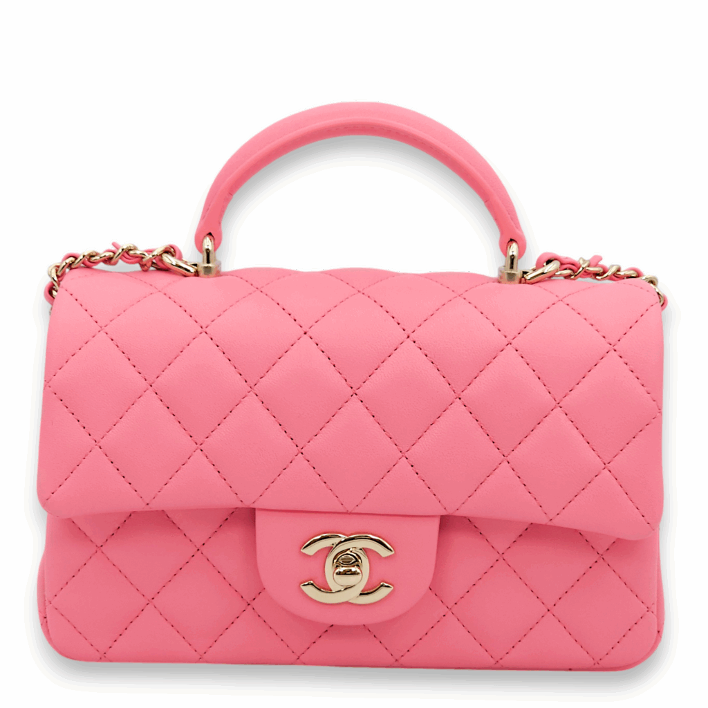 Rectangle (Quilted) Mini Pink Top Handle Bag in Lambskin, Gold hardware