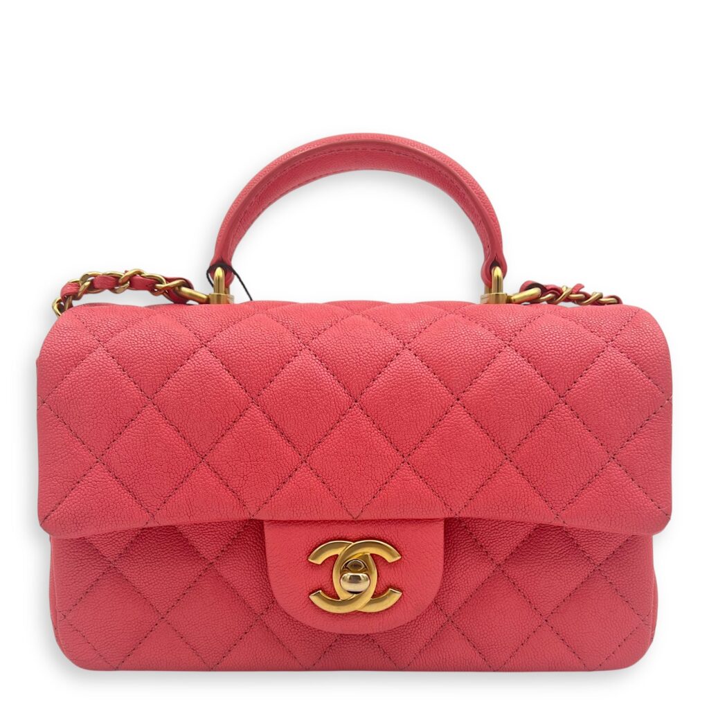 Rectangle Flap Mini Pink Top Handle Bag in Caviar Leather, Brushed Gold hardware
