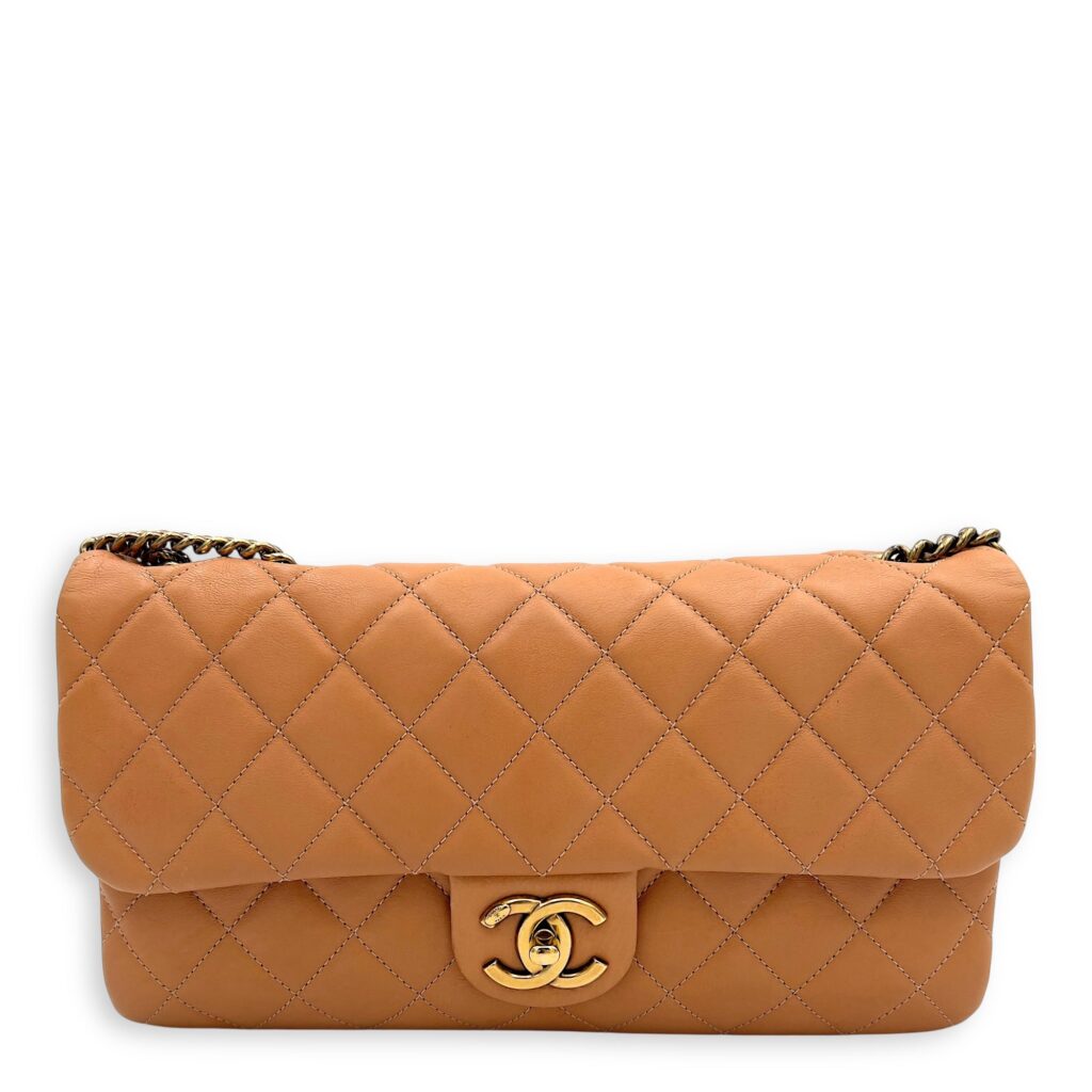Quilted Zip Back Pocket Flap Shoulder Bag Brown in Calfskin, Gold hardware