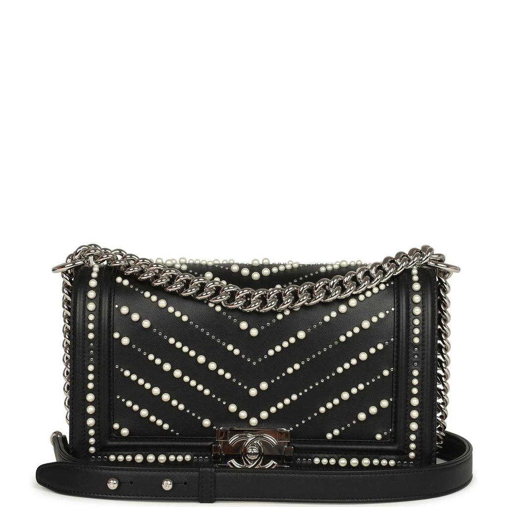 Chanel Medium Boy Bag Black Pearl Chevron Calfskin Silver Hardware Shop for an authentic Chanel Medium Boy Bag with Pearls in black chevron calfskin leather and silver hardware in never worn condition at Madison Avenue Couture.
