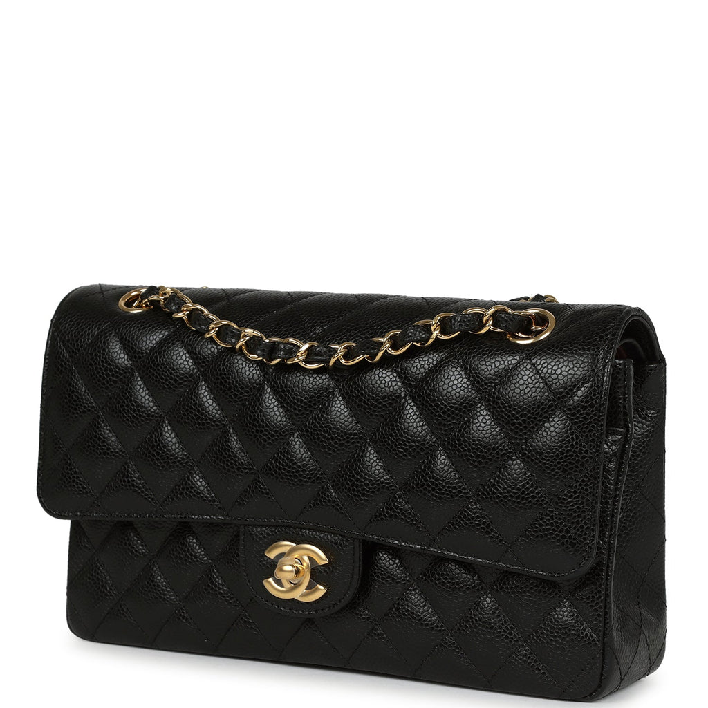 Chanel Medium Classic Double Flap Bag Black Caviar Gold Hardware Shop for an authentic Chanel Medium Classic Double Flap Bag in black caviar leather with gold tone hardware in new and never worn condition at Madison Avenue Couture