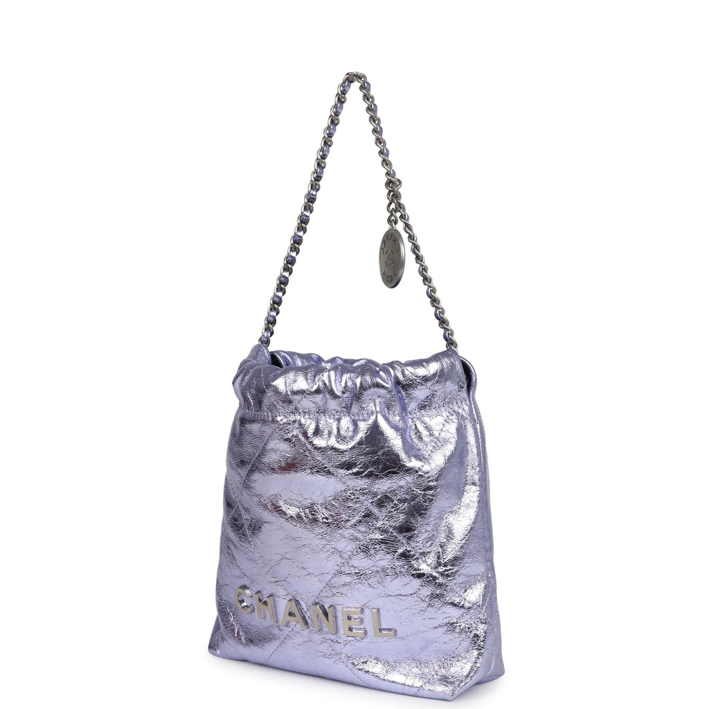 Chanel Mini 22 Bag Purple Metallic Calfskin Brushed Silver Hardware Shop for an authentic Chanel Mini 22 bag in metallic purple calfskin leather with brushed silver tone hardware in new and never worn condition at Madison Avenue Couture.