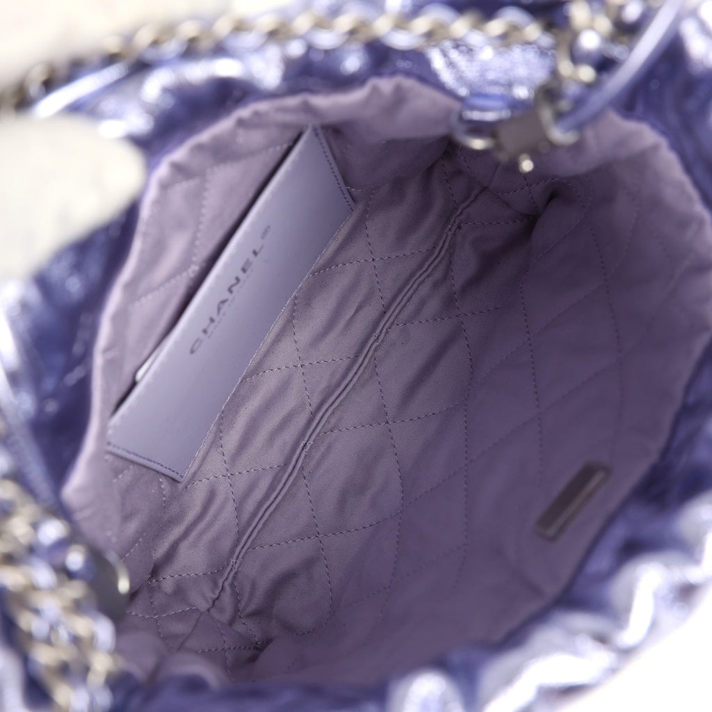 This Chanel Mini 22 Hobo Bag is in purple metallic calfskin leather with brushed silver tone hardware, has signature quilted leather, brushed silver tone metal “Chanel” logo on front of bag, Chanel Paris metal hang tag, brushed silver chain link interwoven with leather and one removable long leather cord act as shoulder and cross body strap.The interior is lined in light purple fabric with one slip pocket on the rear wall.Collection: 25C (RFID)Origin: ItalyCondition: New and never wornAccompanied by: Chanel box (slightly damaged), Chanel dustbag, retail UPC, RFID and ribbonMeasurements: 7.8″ width x 7.4″ height x 2.3″ depth; 21″ strap drop