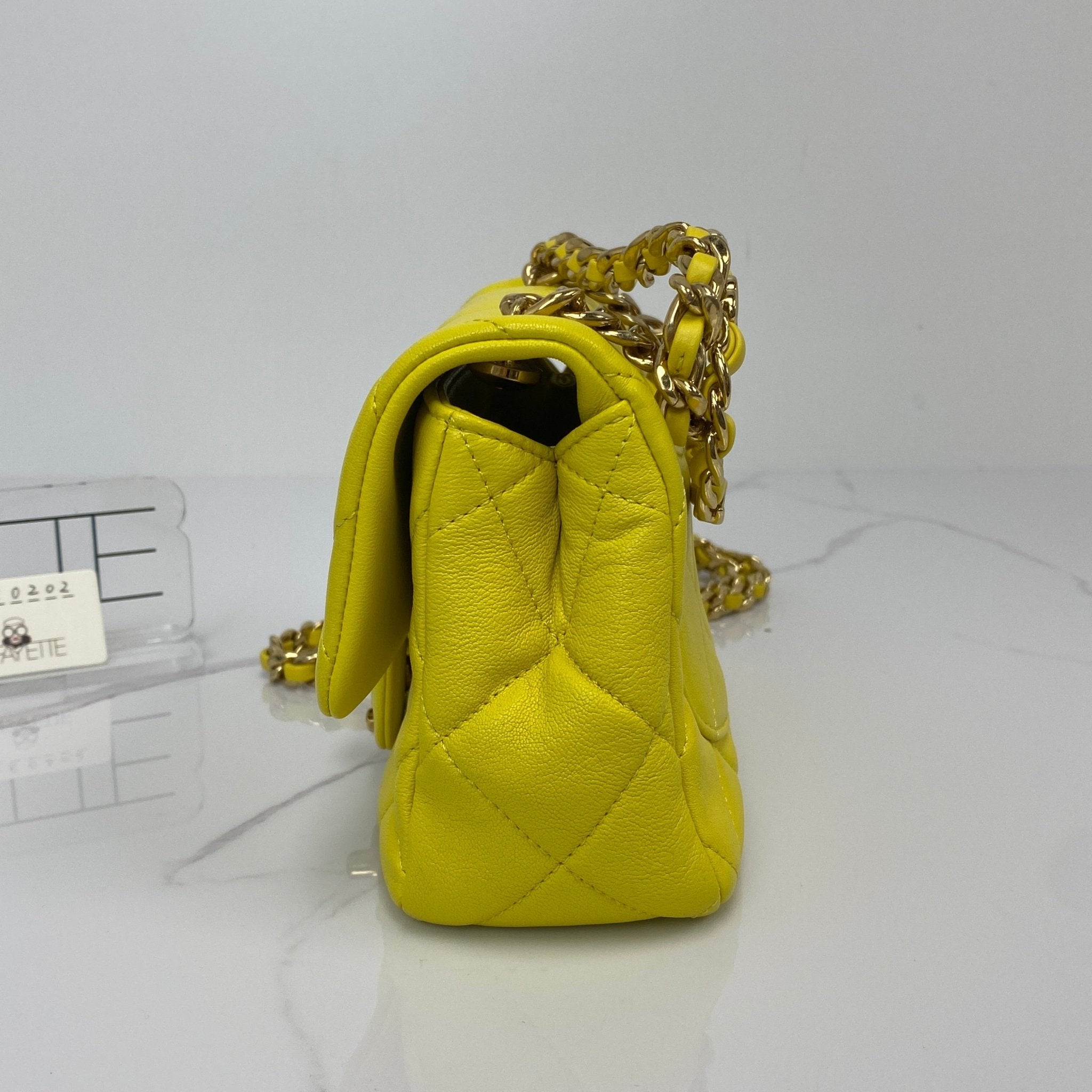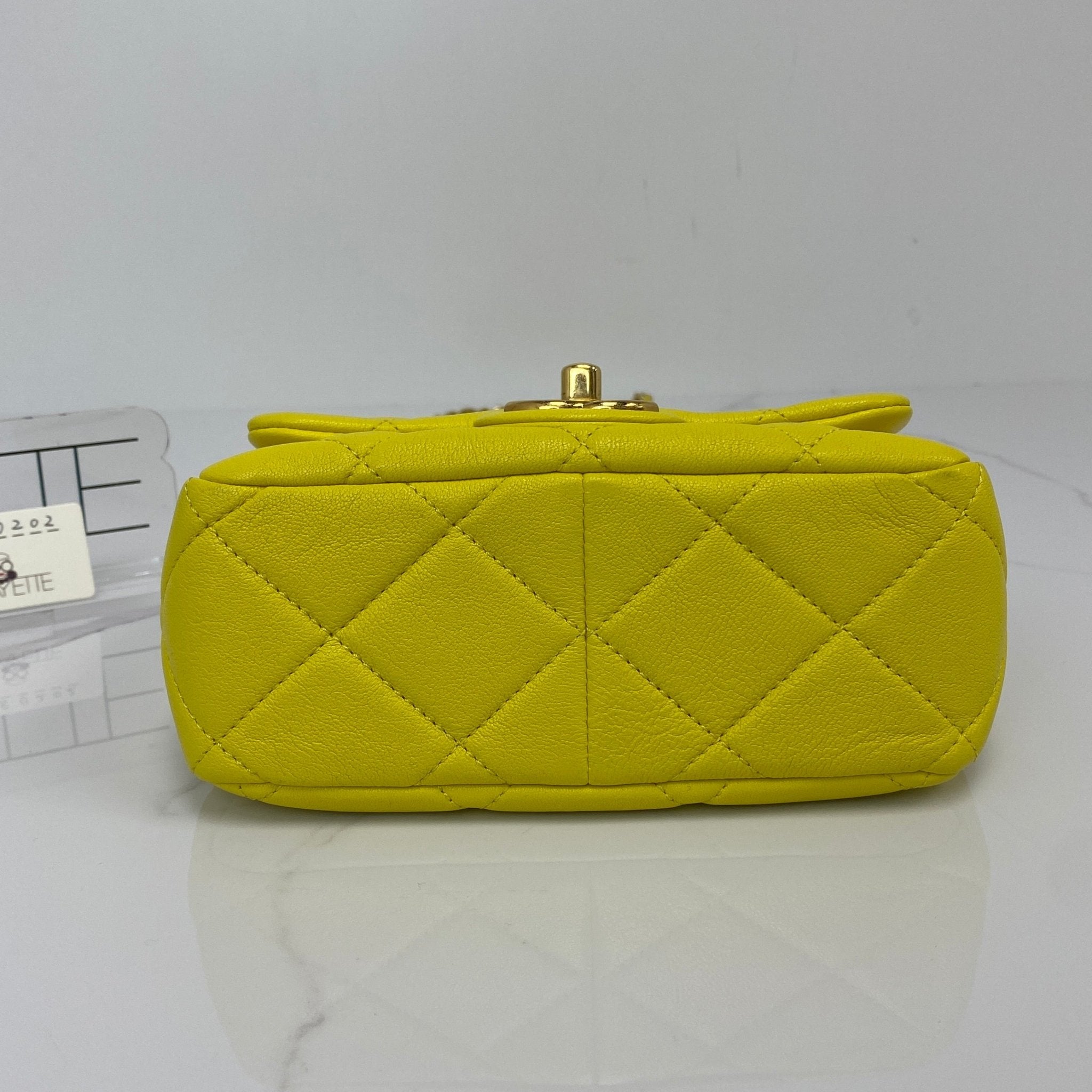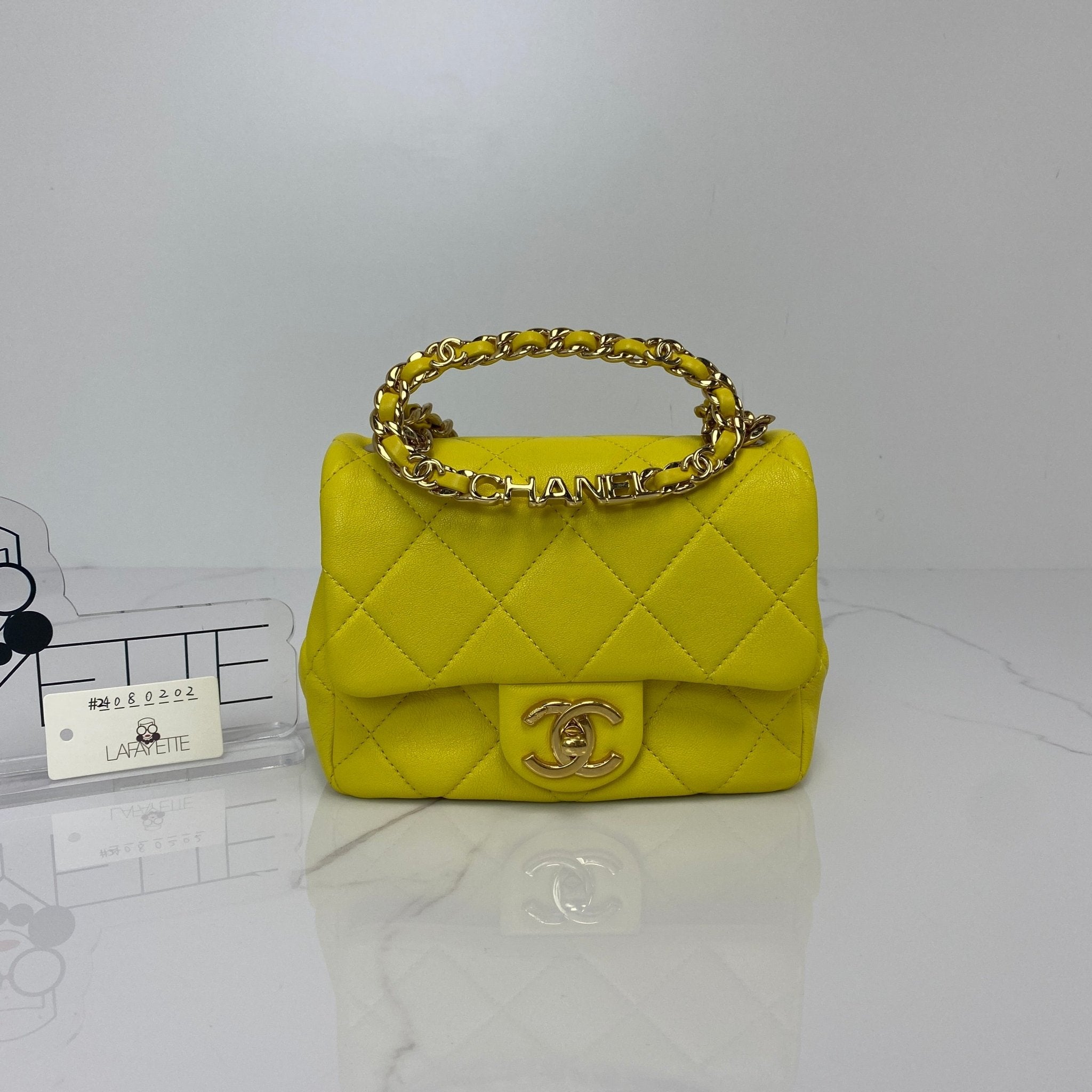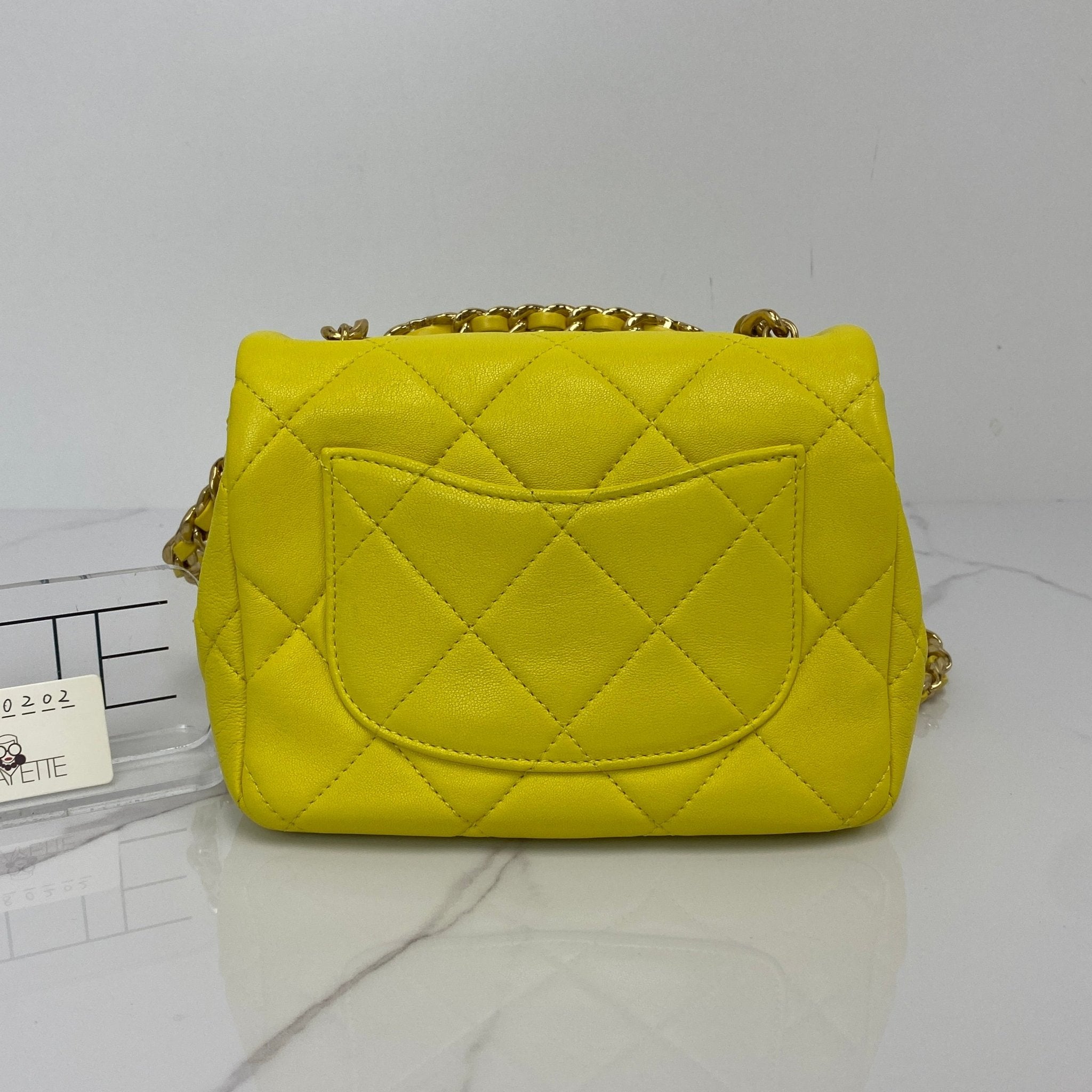 Brighten up your look with the Chanel Mini Top Handle Square Flap in yellow lambskin. Its compact size and vibrant hue make it the perfect statement piece, easily transitioning from day to night. Whether paired with jeans or a chic dress, this bag adds a pop of color and a touch of luxury to any outfit.