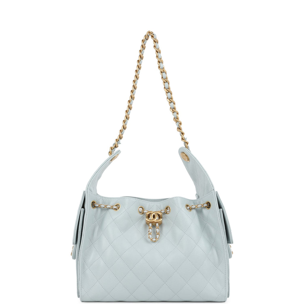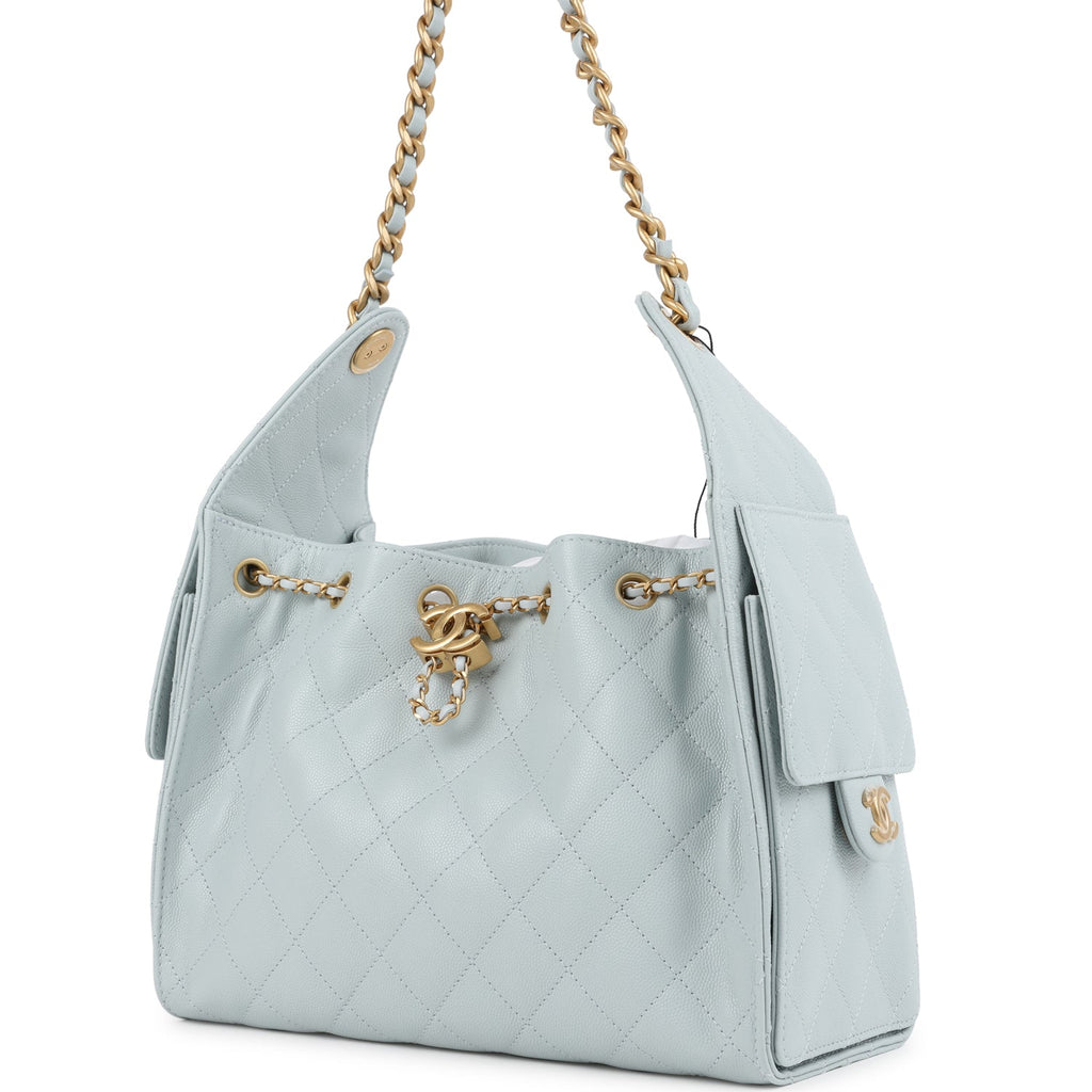 Chanel Small 25 Hobo Bag Light Blue Caviar Antique Gold Hardware Shop for an authentic Chanel Small 25 Hobo Bag in light blue grained calfskin with antique gold hardware in new and never worn condition at Madison Avenue Couture.