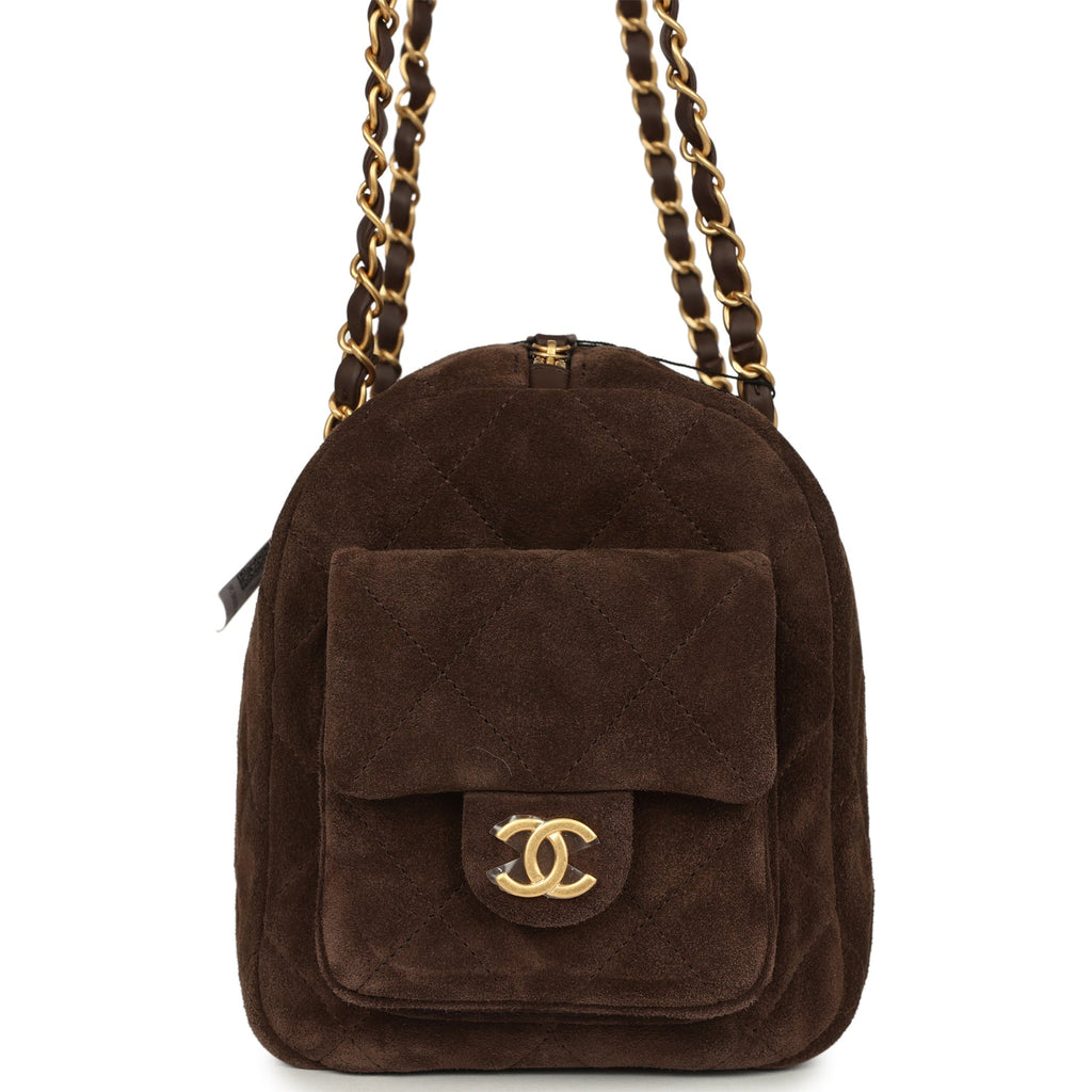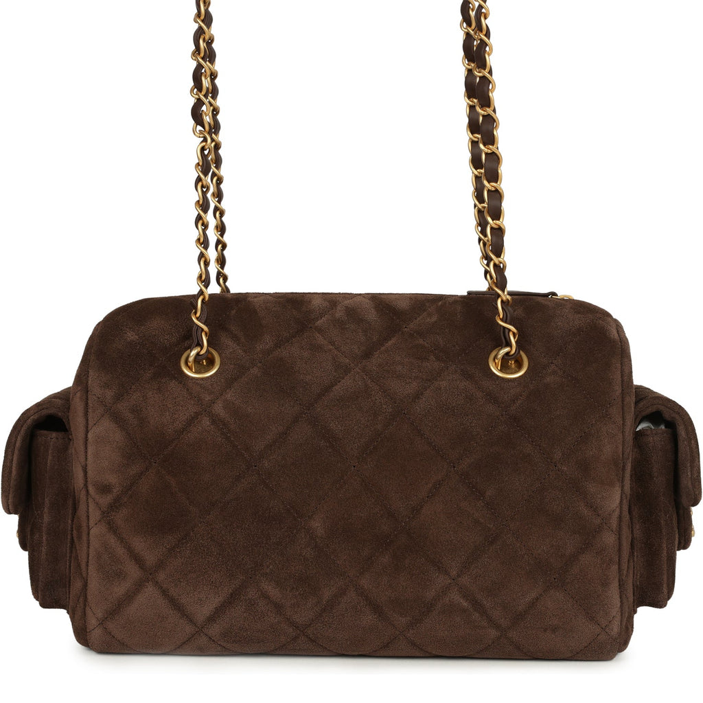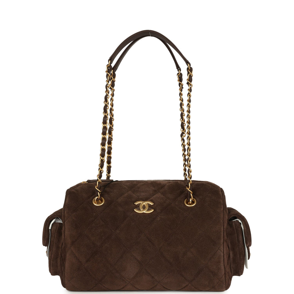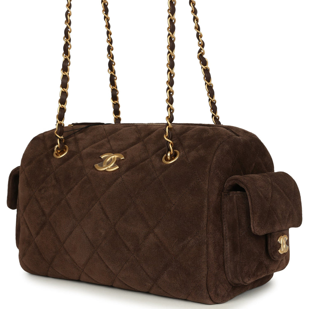 Chanel Small Bowling Bag Dark Brown Suede Antique Gold Hardware Shop for an authentic Chanel Small Bowling Bag in dark brown suede with antique gold hardware in new and never worn condition at Madison Avenue Couture.