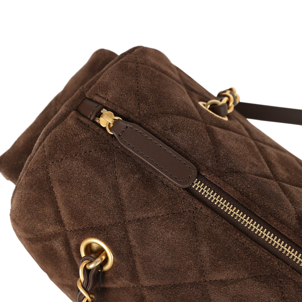This Chanel Small Bowling Bag is in dark brown suede with antique gold hardware, featuring signature diamond quilt, a front CC antique gold tone logo on the front, two exterior side pockets, and two Interwoven antique gold and dark brown leather top handles.The interior is lined in dark brown grossgrain fabric and has one zip pocket on the rear wall with Chanel logo pull.Collection: 25K (RFID)Origin: ItalyCondition: New and never worn (plastic on CC hardware)Accompanied by: Chanel box, Chanel dustbag, felt, RFID chip, retail UPC, ribbon,Measurements: 11″ width x 9″ height 6.25″ depth; shoulder strap drop: 12″