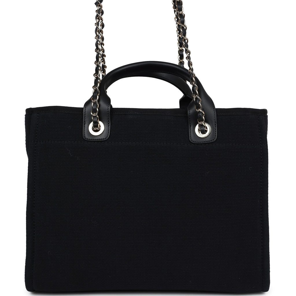 Chanel Small Deauville Shopping Tote Black Canvas Light Gold Hardware Shop for an authentic Chanel small Deauville shopping tote in black canvas with light gold tone hardware in new and never worn condition at Madison Avenue Couture.