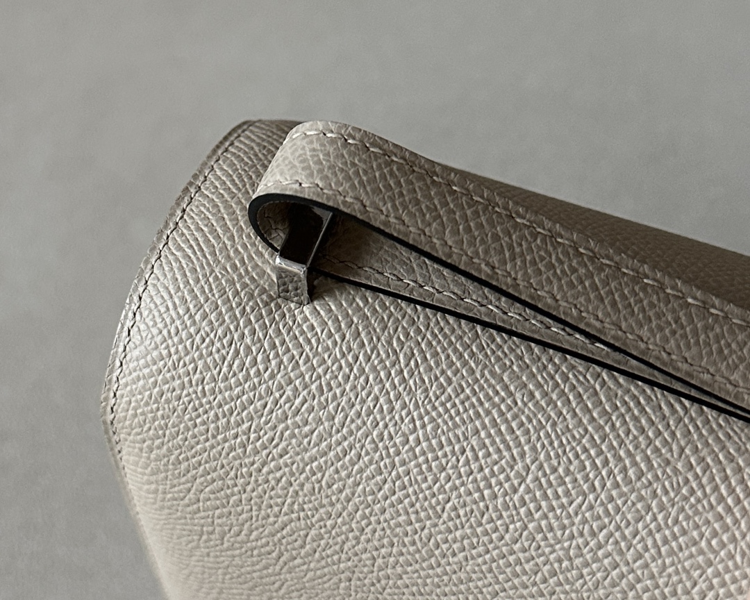 The bag features a long shoulder strap , including an H buckle on the flap.