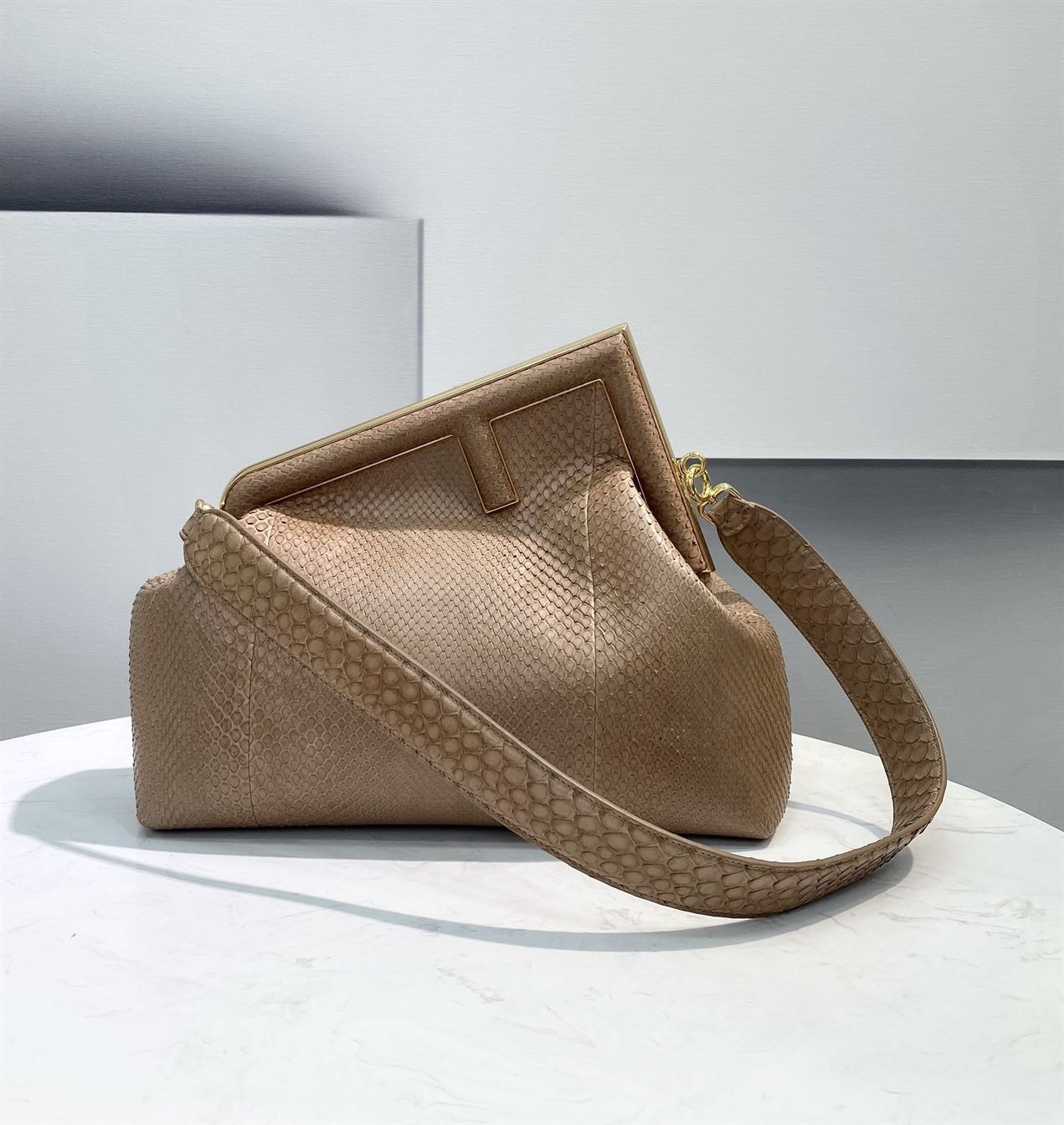 Fendi First Small Beige python bag is very good. Lifting of scales on exterior and strap, scratches on hardware.