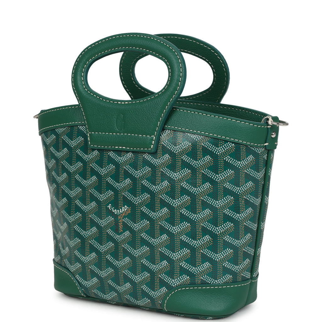 This Goyard Beluga Mini Bag is of green Goyardine coated canvas and Chevroches calfskin leather with palladium hardware, featuring white contrast stitching, green Chevroches calfskin trimming, two top handles, and a detachable, adjustable shoulder strap.The interior is lined with linen and cotton canvas fabric and features an inside pouch with a drawstring closure.Origin: FranceCondition: New and never wornAccompanied by: Goyard box, Goyard dustbag, detachable strap, strap dustbag, carebook, retail tag, ribbonMeasurements: 9.1” x 3.2″ x 7.3″; 1.6″ handle; shoulder strap: 19.3″ – 21.7″