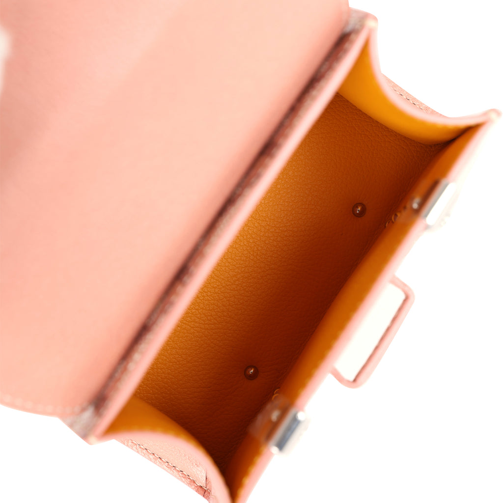 This 2024 Limited Edition Goyard Saigon Structure Nano Bag is in iridescent coral pink Goyardine coated canvas and Iridescent chevroches calfskin lining with palladium hardware, contrast stitching, black wooden top handle, and a detachable shoulder strap.The interior is lined in yellow Nievre goatskin lining and has one interior slip pocket on rear wall.Origin: FranceCondition: New and never worn (plastic on handles)Accompanied by: Goyard box, dustbag, strap, strap dustbag, carebook and feltMeasurements: 5.7” x 4.5″ x 2.75″; 2.25″ handle, 18-22″ shoulder strap