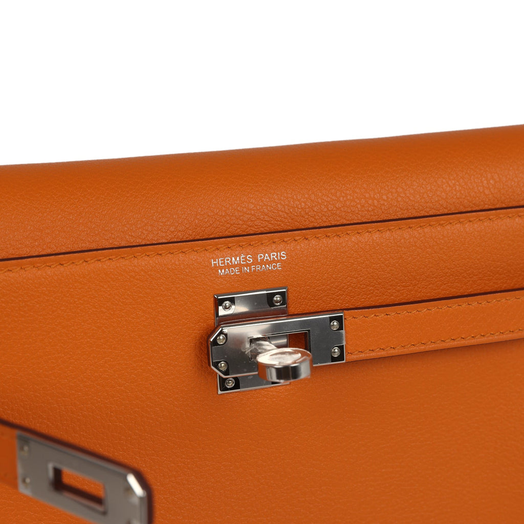 Hermes Kelly Danse Abricot Verso Evercolor Palladium Hardware Shop for an authentic Hermes Kelly Danse in Abricot verso evercolor leather with palladium hardware in new and never worn condition at Madison Avenue Couture.