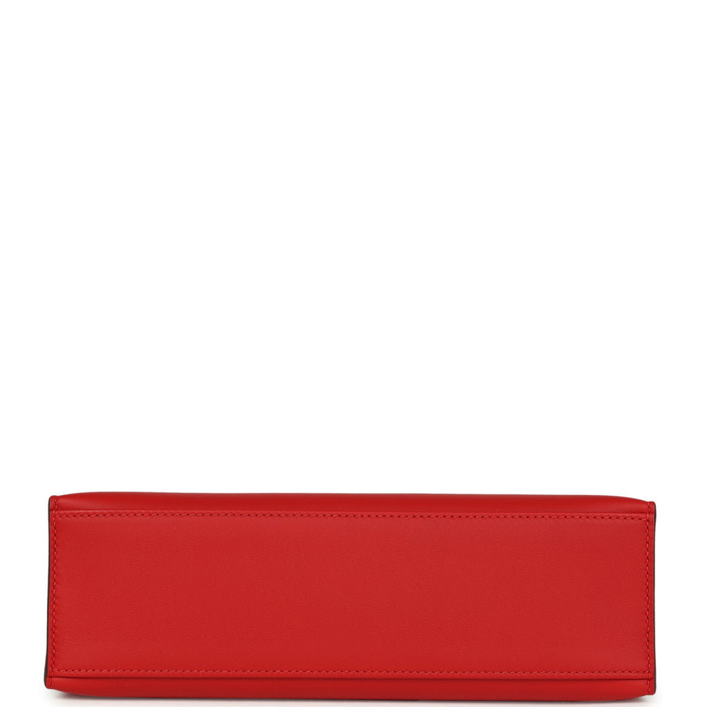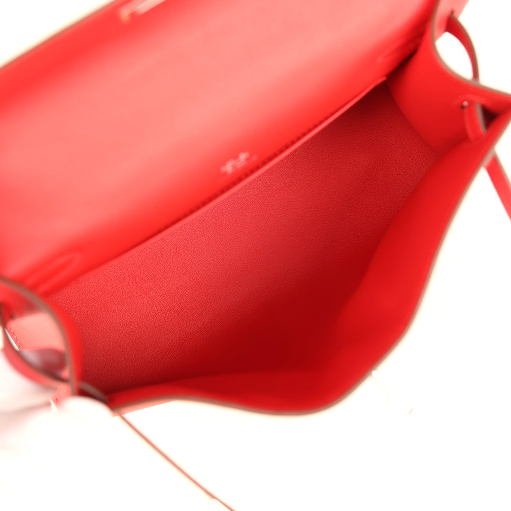 Hermes Kelly Pochette Rouge Radieux Swift Palladium Hardware Shop for an authentic Hermes Kelly Pochette in Rouge Radieux swift leather with palladium hardware in new and never worn condition at Madison Avenue Couture.