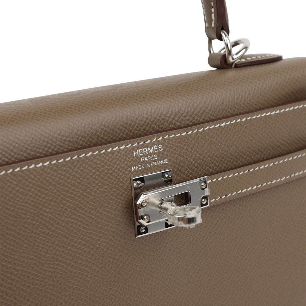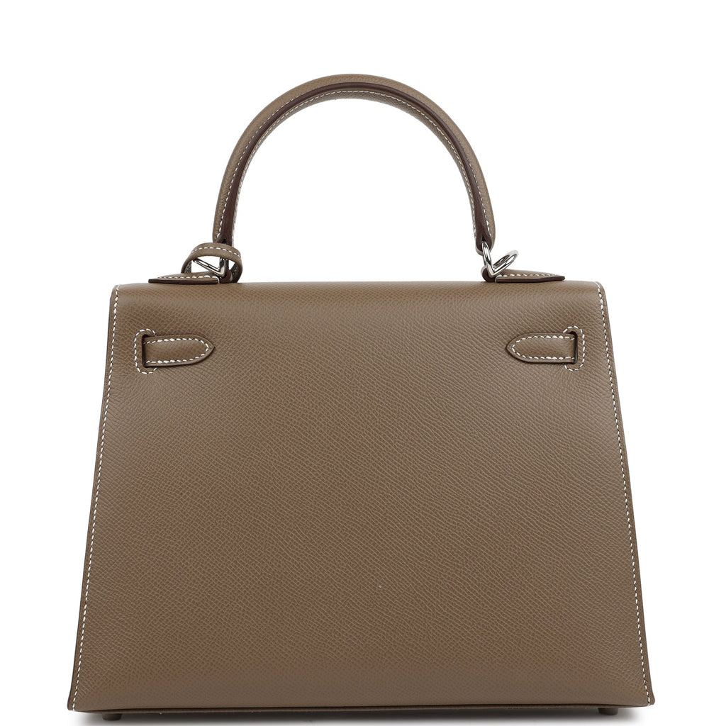 Hermes Kelly Sellier 25 Etoupe Epsom Palladium Hardware Shop for an authentic Hermes Kelly Sellier 25 in Etoupe Epsom leather with palladium hardware in new and never worn condition at Madison Avenue Couture.