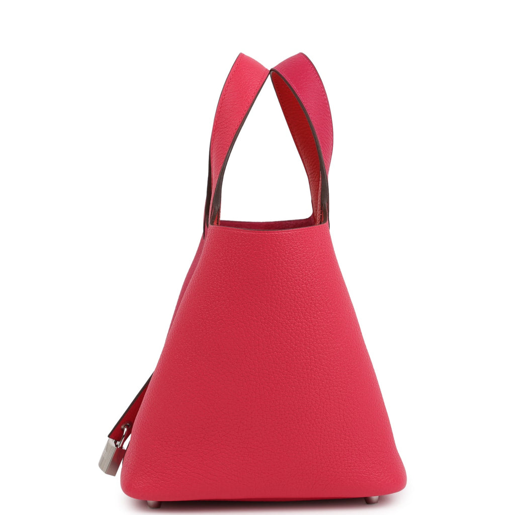 Hermes Picotin Lock 18 Casaque Rose Extreme and Rose Mexico Palladium Hardware Shop for an authentic Hermes Picotin 18 Casaque in Rose Extreme and Rose Mexico in clemence leather with palladium hardware in never worn condition at Madison Avenue Couture.