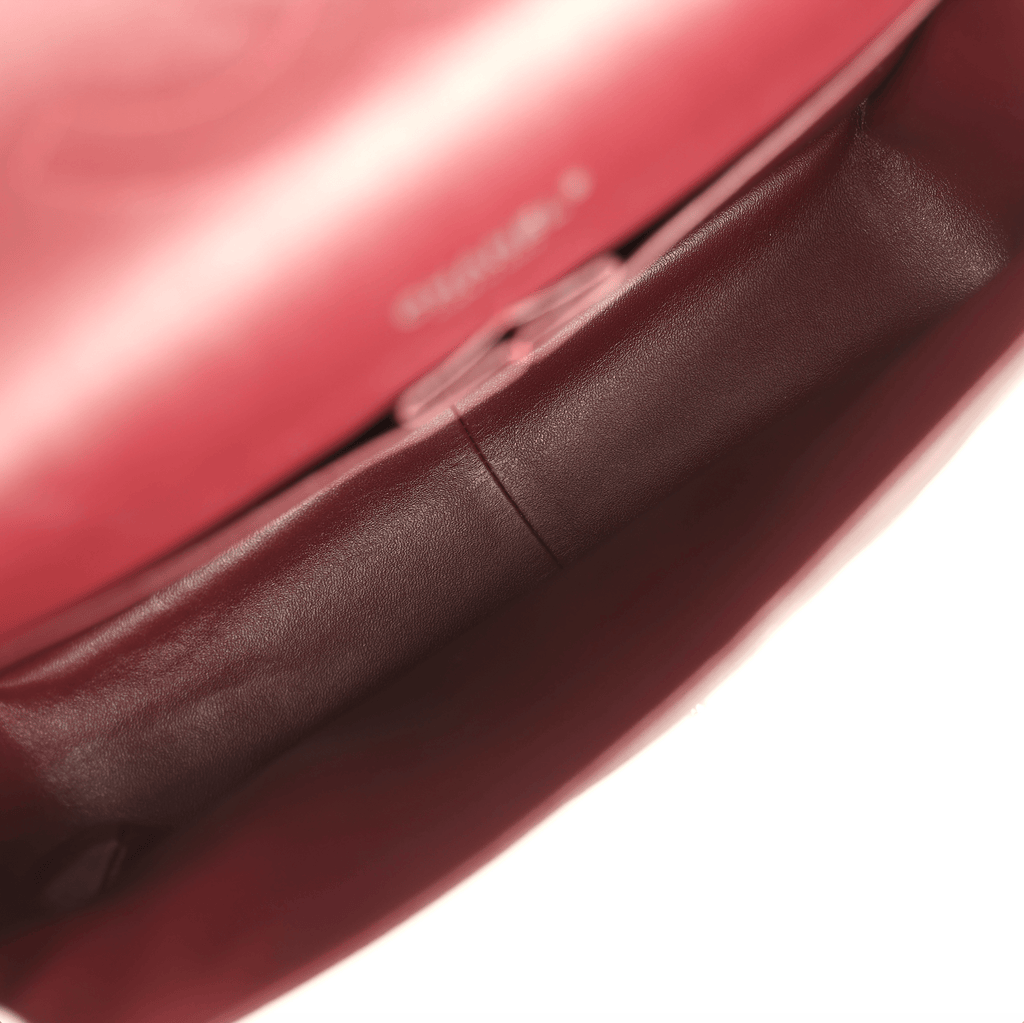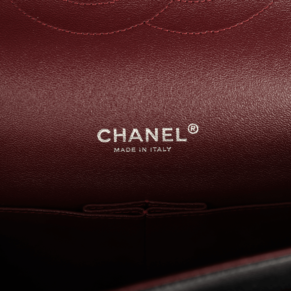 This Maxi Classic Double Flap bag is in Black Caviar leather with silver hardware and features a front flap with signature CC turnlock closure, half moon back pocket, and adjustable interwoven silver chain link and Black leather shoulder strap.The interior is lined in Burgundy leather with a “love letter” zipper compartment under the first flap, an “outer” slit pocket under the second flap, and an interior compartment with two open pockets separated by a “lipstick” compartment.Collection: 19-series (2014)Origin: ItalyCondition: Pre-owned; Mint – This bag retains its shape structure. There is no plastic on the hardware, resulting in light scratching to the turnlock and some hairline scratches to the front CC hardware. The exterior leather is clean with no signs of wear. The interior leather is clean with no signs of wear.Accompanied by: Chanel box (preowned), Chanel dustbag, felt, COA card, carebookMeasurements: 13″ width x 8.5″ height x 4″ depth; 19″ strap drop (10.5 doubled)