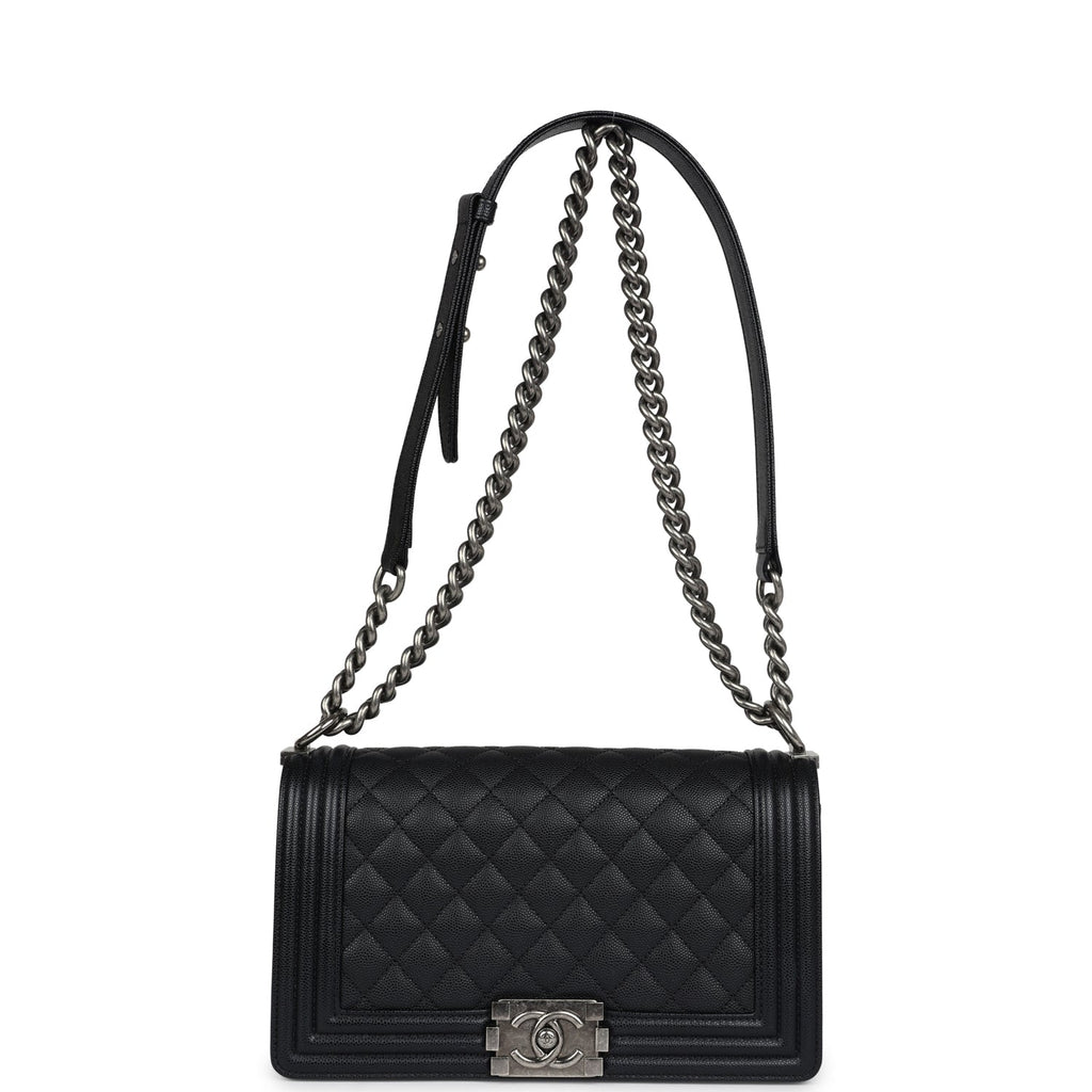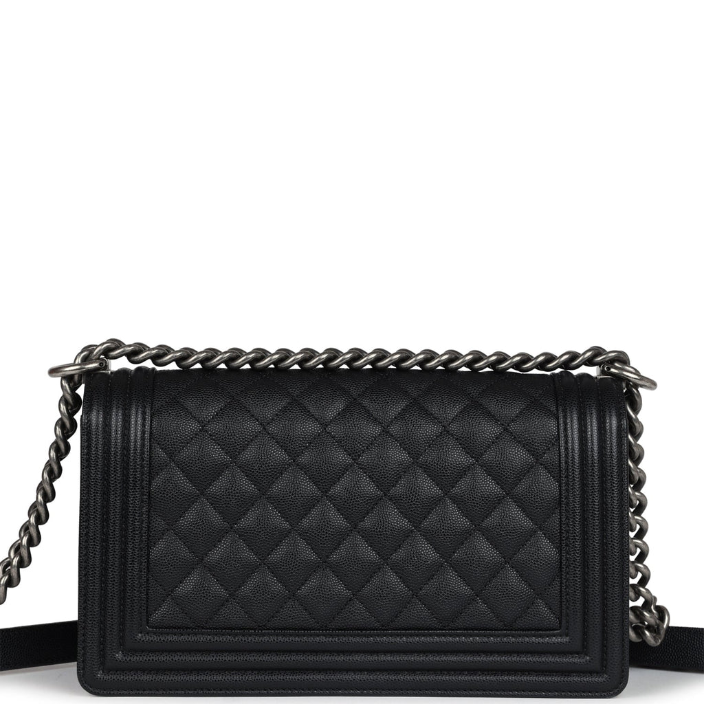 Pre-owned Chanel Medium Boy Bag Black Caviar Aged Ruthenium Hardware Shop for an authentic pre-owned Chanel Medium Boy Bag in black caviar leather with aged ruthenium hardware in mint condition at Madison Avenue Couture.