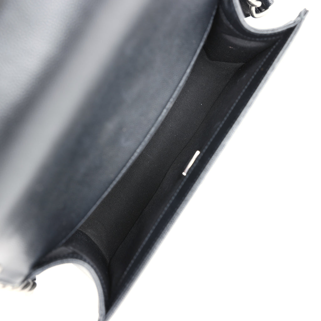 This Medium Boy Bag is in black caviar leather with aged ruthenium hardware and features a full front flap with the Le Boy CC push lock closure and an aged ruthenium chain link and black leather padded shoulder/crossbody strap.The interior is lined in black leather with an open pocket on rear wall.Collection: REV (RFID)Origin: ItalyCondition: Pre-owned; Mint – This bag retains its shape structure. The exterior leather is clean with no signs of wear or use. There is no plastic on the hardware. There are no signs of scratching. The interior leather has some minor spots on the grossgrain interior fabricAccompanied by: Chanel dustbag, retail UPC, RFID chipMeasurements: 9.8″ width x 6″ height x 3.5″ depth; 22″ strap drop (12″ doubled)