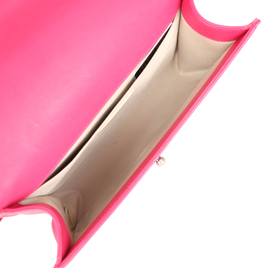 This Chanel Old Medium Boy Bag is in pink lambskin leather with aged ruthenium hardware, featuring tonal stitching, front flap with Le Boy CC push closure, smooth leather trim, and aged ruthenium chainlink and Pink leather shoulder strap.The interior is lined in beige grossgrain fabric and has one slit pocket on rear wall.Collection: 19-Series (2014)Origin: FranceCondition: Pre-owned; Excellent – This bag is relaxed in shape structure. The exterior leather has noticeable wear with rubbing to the bottom corners and there is some creasing, a few press markings on the front, and overall wear to the leather. There are no signs of wear to the hardware. The interior leather has light scuff markings on the flap and the interior canvas a a few tiny stains to the interior. The interior canvas has a faint smell.Accompanied by: Chanel box, Chanel dustbag, carebook, COA cardMeasurements: 9.8″ width x 5.9″ height x 3.5″ depth; 22″ strap drop (12″ doubled)