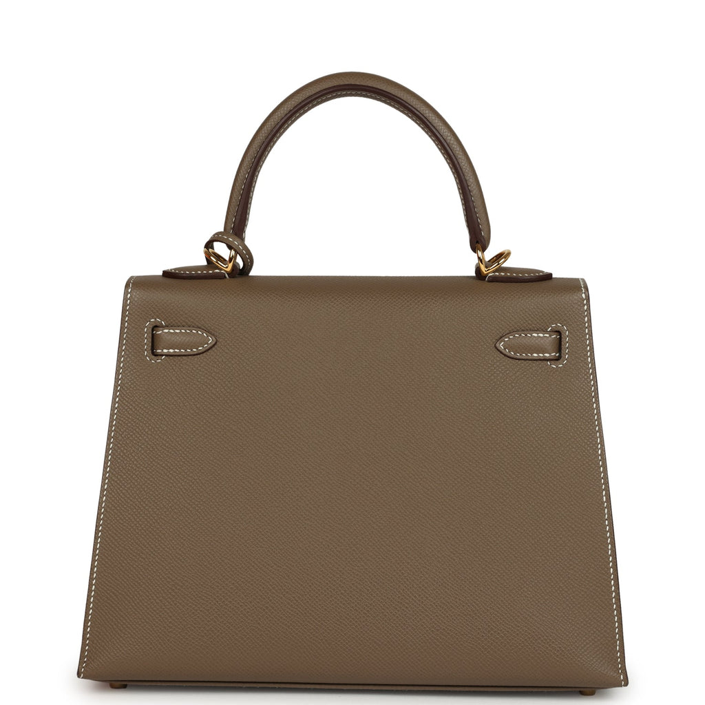 Pre-owned Hermes Kelly Sellier 25 Etoupe Epsom Gold Hardware Shop for an authentic pre-owned Hermes Kelly Sellier 25 in Etoupe epsom leather with gold hardware in mint condition at Madison Avenue Couture.