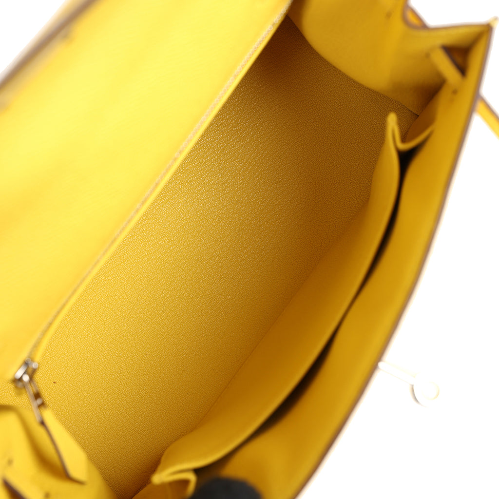 This Kelly, in the Sellier style, is in Jaune De Naples epsom leather with palladium hardware and has tonal stitching, two straps with front toggle closure, clochette with lock and two keys, single rolled handle and removable shoulder strap.The interior is lined with Jaune De Naples chevre leather and has one zip pocket with an Hermes engraved pull and one open pocket on the opposite side.Collection: U (2022)Origin: FranceCondition: Pre-owned; Excellent – This bag retains it shape. There is plastic on the hardware except for the turnlock. The hardware rivets are a little tarnished. The exterior leather has two scuffs on the front of the bag; one tiny dot of a scuff and one larger scuff. The interior leather is clean with no signs of wear or use.Accompanied by: Hermes dustbag, strap, strap dustbag, lock, two keys, clochette, clochette dustbag, felt, carebook, rainhatMeasurements: 9.8″ width x 7″ height x 3.75″ depth; 3.75″ handle drop (16.5″ shoulder strap drop)