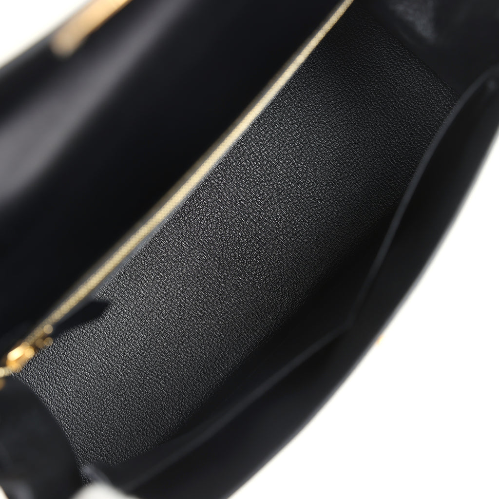 This Kelly, in the Sellier style, is of Black Box calfskin leather with gold hardware and has tonal stitching, a front toggle closure, a clochette with lock, two keys, a single rolled handle and removable shoulder strap.The interior is lined with Black chevre leather and has one zip pocket with an Hermes engraved pull and two open pockets on the opposite side.Collection: Y (2020)Origin: FranceCondition: Pre-owned; Excellent to Mint- This bag retains its shape structure. There is plastic on all the hardware except for the turnlock and the strap clasps. The exposed turnlock has some moderate scratching and the exposed shoulder strap clasps have some light hairline scratches. The hardware plaque on the front flap has some tarnishing to the rivets under the plastic. The exterior leather is mostly clean with the exception of some minor markings to the front bottom left and bottom base. The leather is clean with minimal signs of wear.Accompanied by: Hermes box, Hermes dustbag, clochette, lock, two keys, shoulder strap, carebook, rainhatMeasurements: 12.75″ width x 9″ height x 4.75″ depth; 3.5″ handle drop (16″ shoulder strap drop)