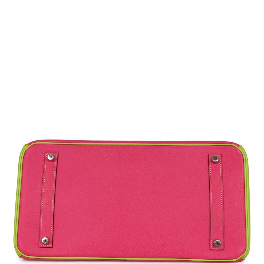 Pre-owned Hermes Special Order (HSS) Birkin 35 Rose Tyrien and Kiwi Epsom Palladium Hardware Shop for an authentic Hermes Birkin 35 (HSS) in Rose Tyrien and Kiwi epsom leather with palladium hardware in excellent to mint condition at Madison Avenue Couture.