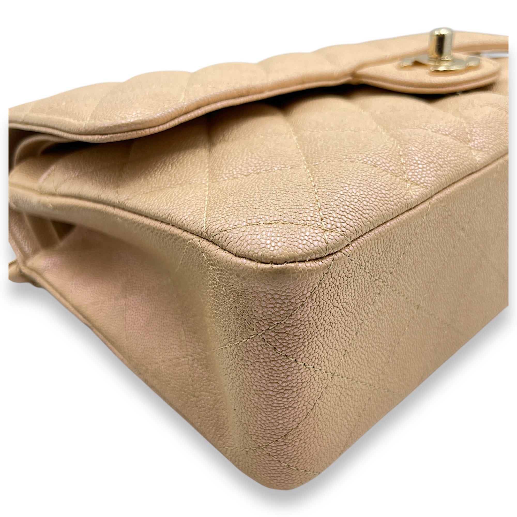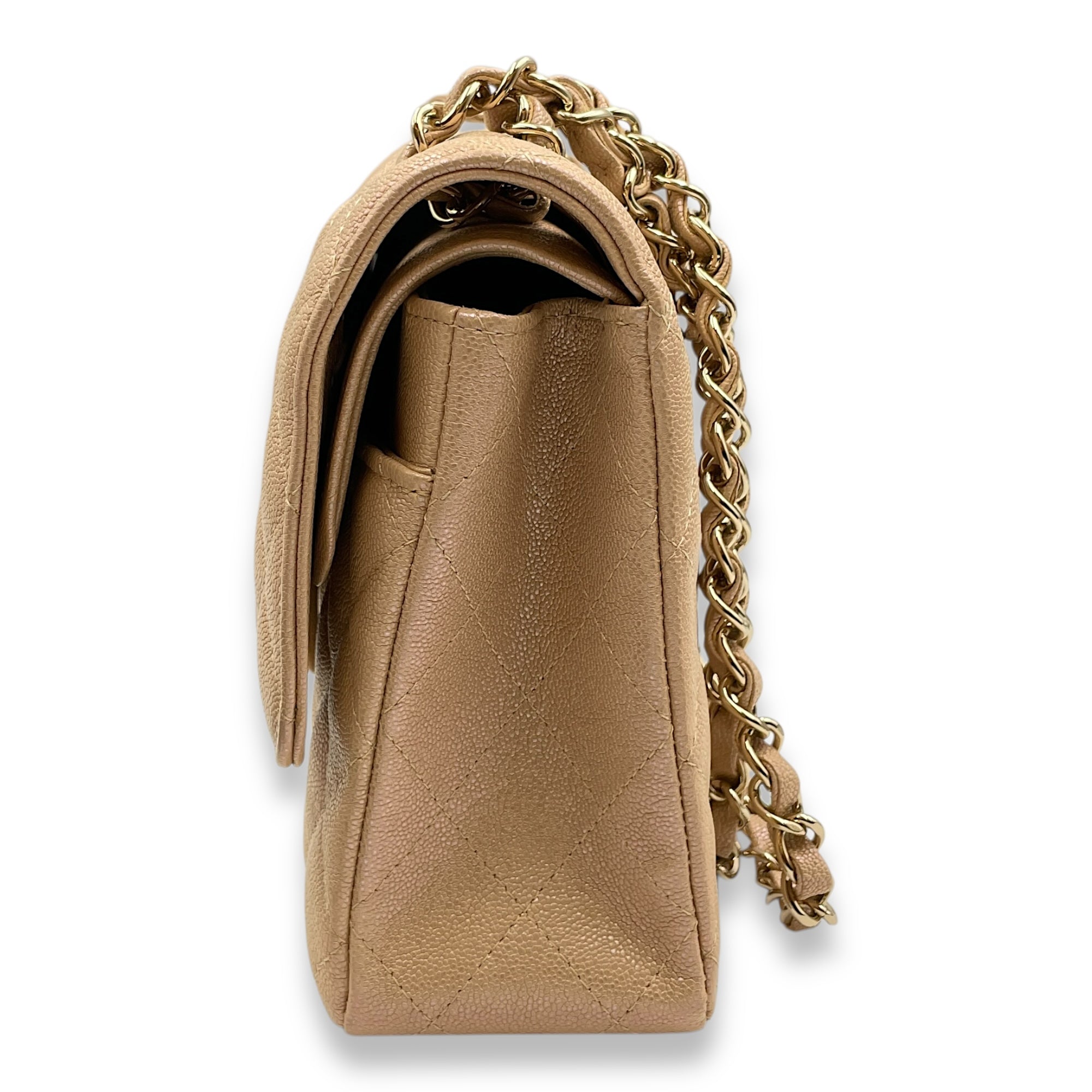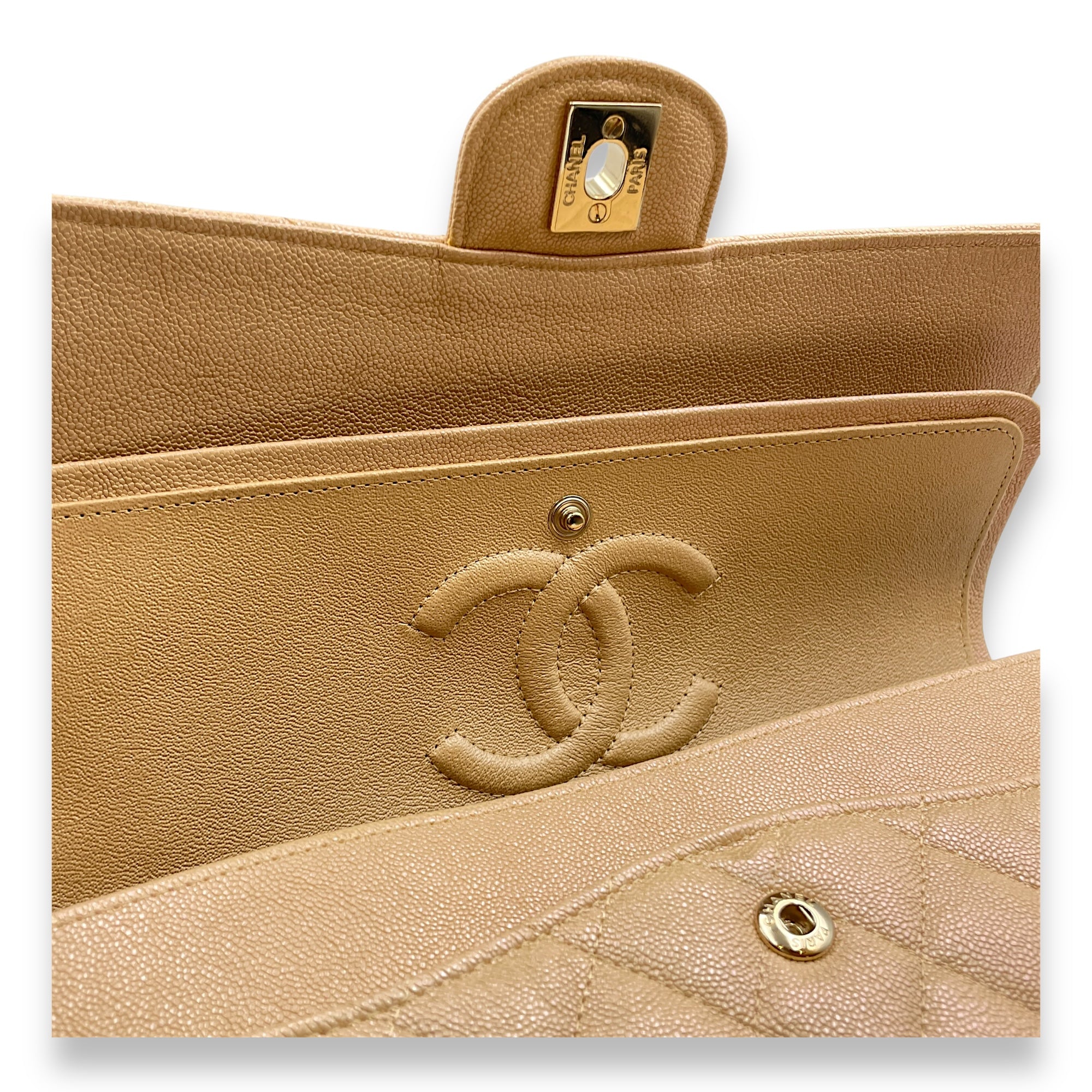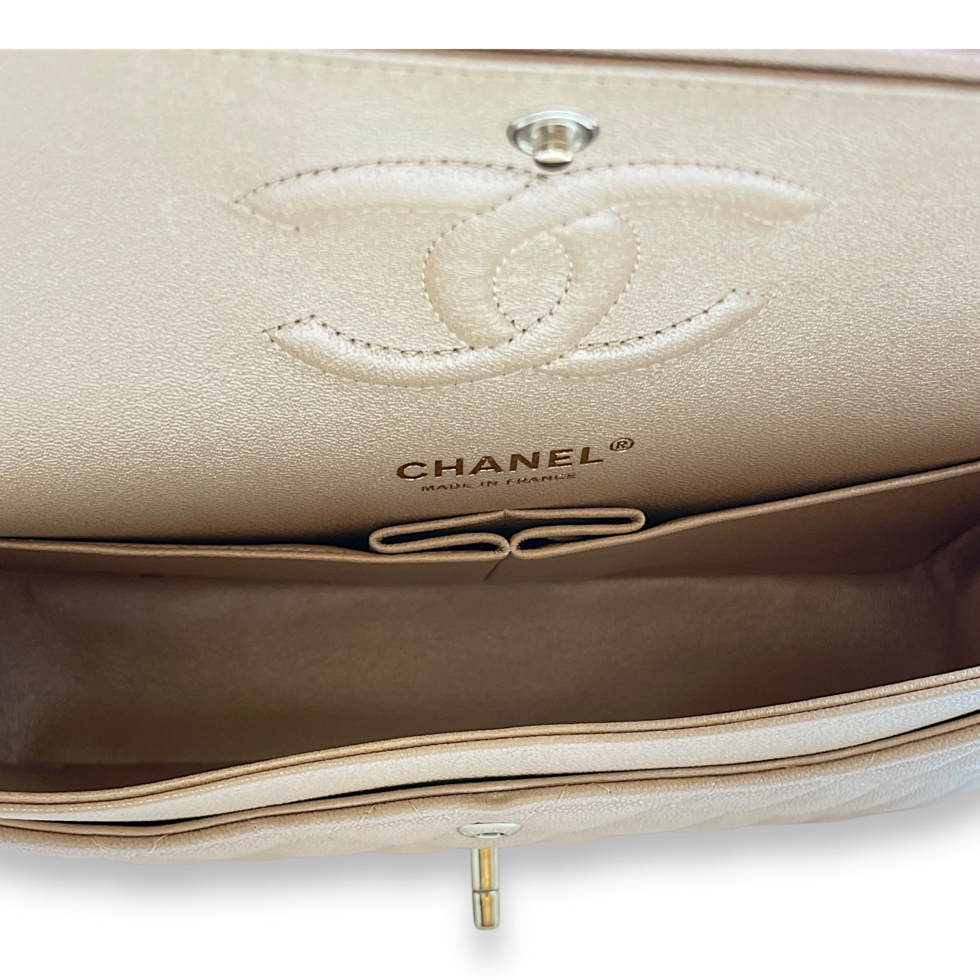 Quilted CC Classic Medium Pearly Beige Double Flap Bag in Caviar Leather, Gold hardware
