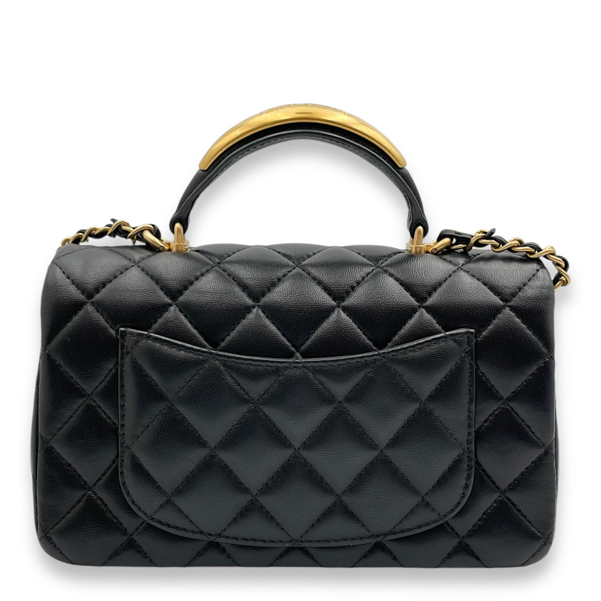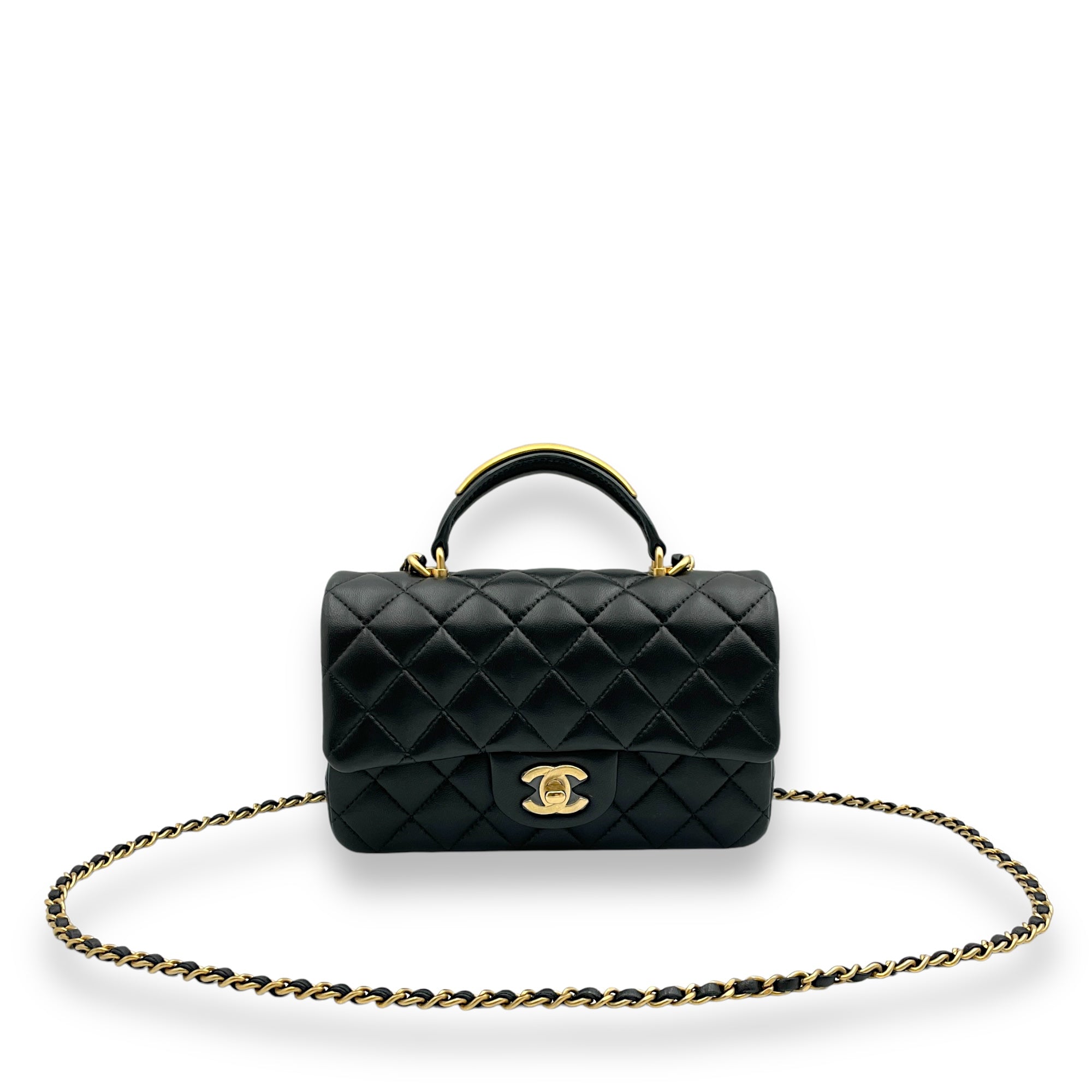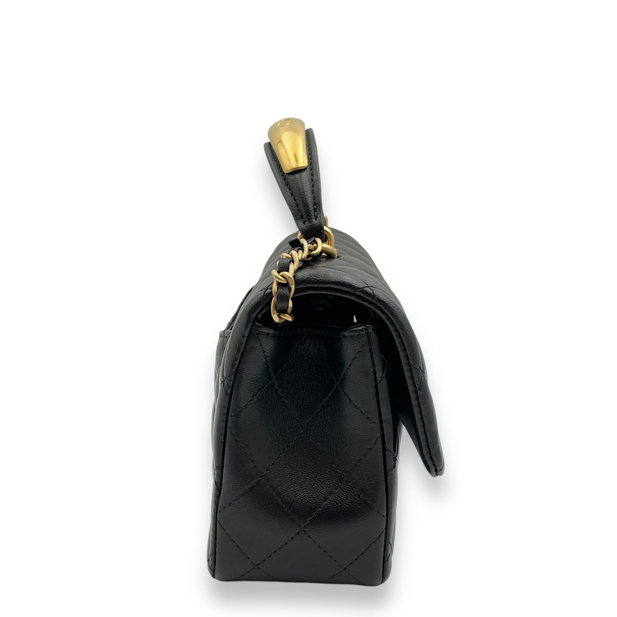 Rectangle with Metal Top Handle Mini Black Crossbody Bag in Lambskin, Gold hardware