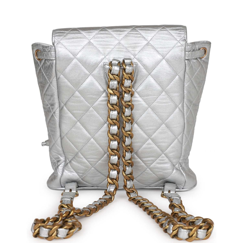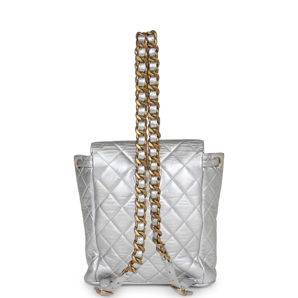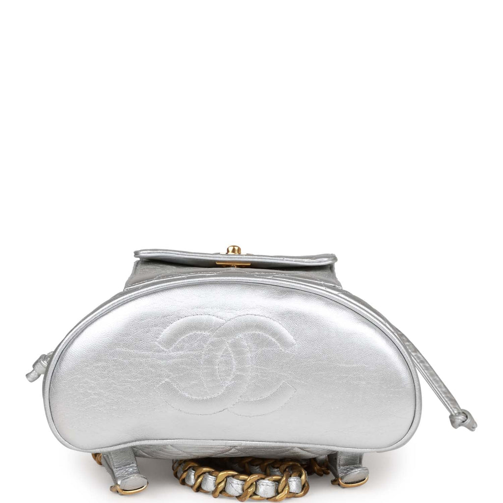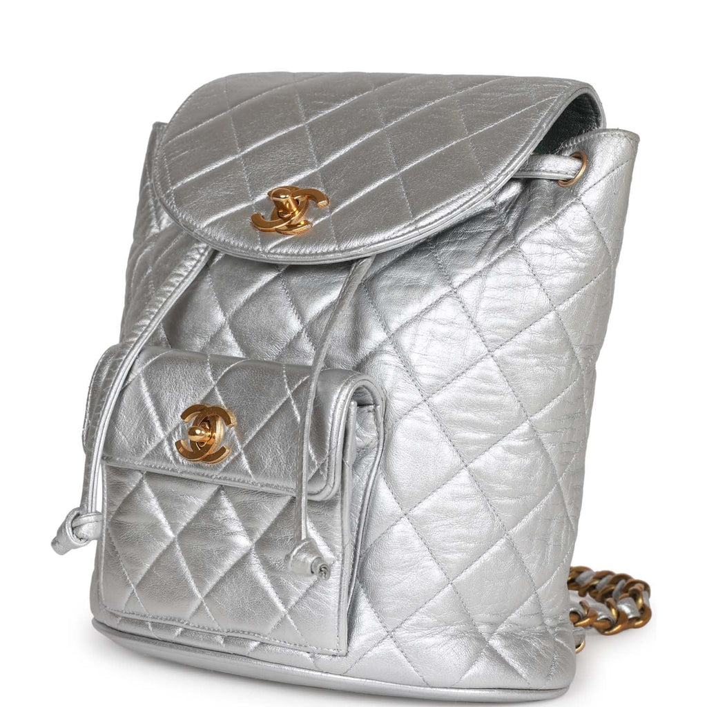 Vintage Chanel Duma Backpack Silver Metallic Lambskin Gold Hardware Shop for an authentic vintage Chanel Small Duma Backpack in silver metallic lambskin with gold hardware in excellent condition at Madison Avenue Couture.