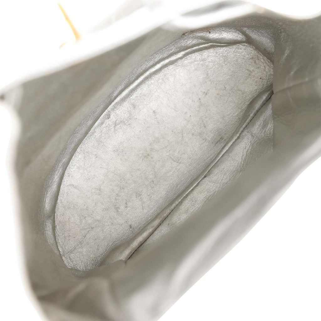 This vintage Duma backpack is in silver metallic lambskin with gold hardware, signature CC interlocking closure with front flap, an additional drawstring closure, exterior front pocket, two shoulder straps for backpack use, and gold metal and silver leather chain.The interior is lined in silver metallic leather.Collection: 2-series (1991-1994)Origin: FranceCondition: Vintage; Excellent – This bag retains it shape. Wear throughout the exterior leather. Rubbing and scratching to trim of leather, around front flap, flap pocket and wear to top of bag around drawstring pull area. Creasing, press marks, and scratching to interior leather and interior base. Sticker is still intact. No plastic on hardware so minor scratching and discoloration to hardware. Discoloring and scratching to backpack straps.Accompanied by: Chanel dustbagMeasurements: 8.5” width x 10″ height x 4.5″ depth, 14″ backpack straps
