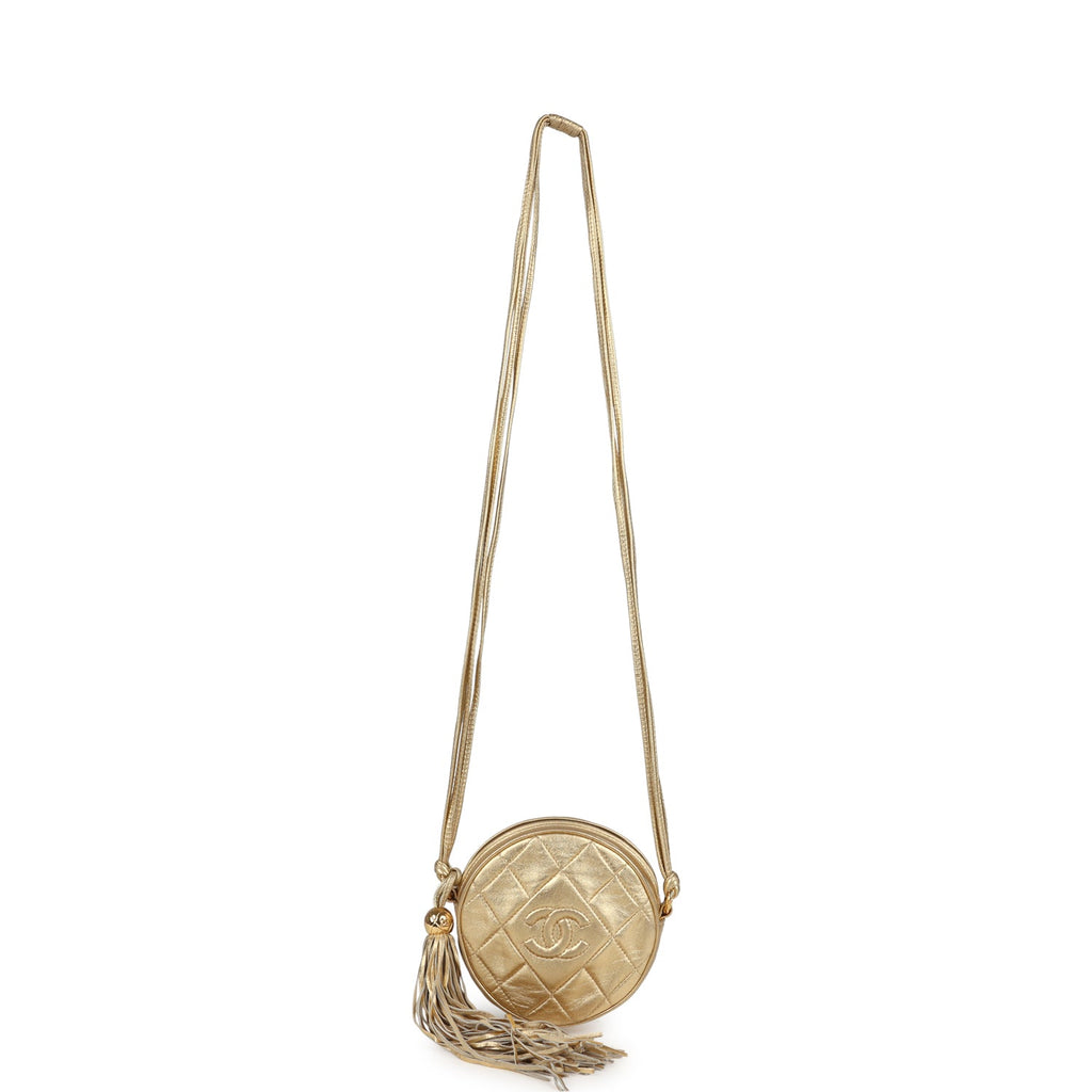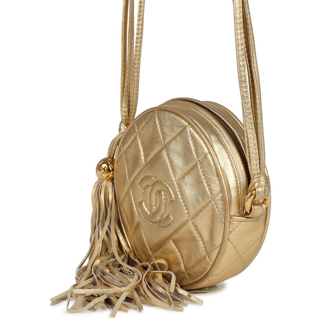 Vintage Chanel Mini CC Round Crossbody Bag Gold Lambskin Gold Hardware Shop for an authentic vintage Chanel Mini CC Round Crossbody Bag in gold lambskin with gold hardware in mint condition at Madison Avenue Couture.