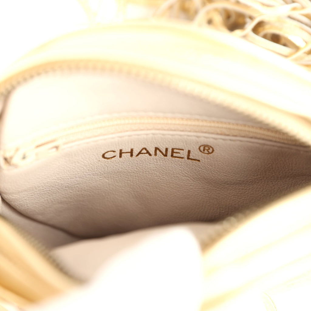 This vintage Chanel Mini CC Round Crossbody Bag is of gold lambskin with gold tone hardware, featuring signature diamond quilt, a quilted CC logo on the front, top zipper closure with tassel zipper pull, and a shoulder strap made of four separate leather straps joined together.The interior is lined in beige leather and has one zip pocket on the rear wall.Collection: 1-series (1989-1991)Origin: France Condition: Vintage; Mint – The bag retains its shape. There is no plastic on the hardware. The hardware is clean with no signs of wear. The exterior leather has some creasing throughout, but is clean.Accompanied by: MAC DustbagMeasurements: 5.25” width x 5.25″ height x 1.5″ depth; 19″ shoulder drop