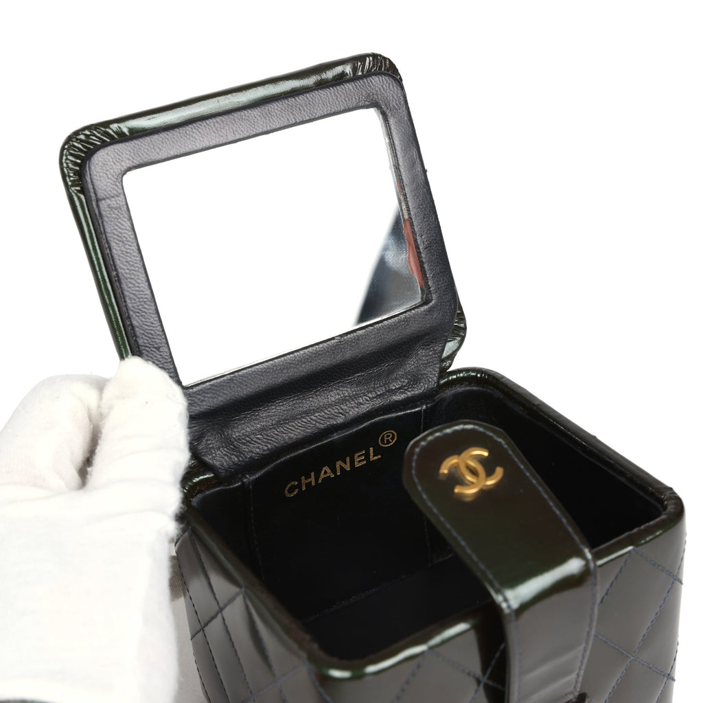 Vintage Chanel Mini Square Vanity Green Patent Antique Gold Hardware Shop for an authentic vintage Mini Square Vanity Box in dark green patent leather with antique gold hardware in excellent mint condition at Madison Avenue Couture.